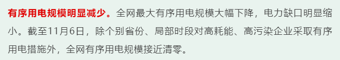 伴隨著(zhe)國家電力保供力度不斷加大(dà),煤炭儲存量不斷突破增長,電力方麵自然也得(dé)到了有效緩解,國家電網於11月7日發布消息表示:
